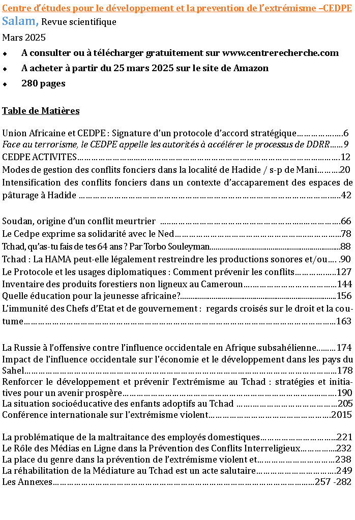 - Renforcer le développement et prévenir l’extrémisme au Tchad : stratégies et initiatives pour un avenir prospère……………190