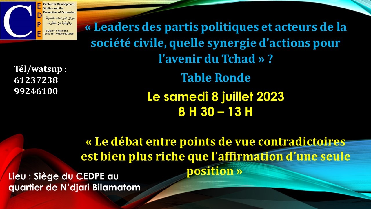 Le Centre d’Études pour le Développement et la Prévention de l’Extrémisme (CEDPE), est une structure apolitique, indépendante, une sorte de Think Tank, un laboratoire d’idées. Fondé grâce à un groupe de cadres tchadiens, il est un pôle d’expertise dans le cadre d’études et de recherche sur les causes et conséquences des maux qui minent la stabilité sociale. Il est devenu une référence au Tchad et ailleurs dans le domaine de la prévention et de la gestion des conflits, dans la stabilisation et le renforcement de la paix. Le centre mène depuis sa création en 2017, des activités qui sont entre autres : la descente sur le terrain pour mener des enquêtes, la publication des ouvrages, la publication de « SALAM » la revue scientifique trimestrielle, l’organisation des ateliers, des conférences débats et participe aux travaux d’études avec des partenaires dans son domaine technique d’expertise. Le centre participe également à des rencontres au niveau national et international. Il dispose des chercheurs et chercheurs-associés de différentes nationalités qui ont des profils divers qui apportent leurs expertises dans le domaine de la recherche. A ce jour, le CEDPE a publié plus de 40 études sur les différents sujets en rapport avec la prévention et la gestion des conflits. La rencontre avec les jeunes pour la sensibilisation contre la radicalisation et pour la prévention des conflits et la question de la paix font partie des activités du centre. Les différentes provinces du Tchad sont des zones de prédilection du CEDPE dès le début du lancement de ses activités, ce qui lui a permis de nouer des contacts accrus tant au sein de l’administration centrale que dans les collectivités déconcentrées. En collaboration avec le comité interministériel chargé de DDR et dans le but de réinsérer les désengagés et désassociés de Boko Haram, le CEDPE a effectué, fin 2019, une mission de profiling des désengagés de Boko Haram et a remis en 2021, une base de données riche de 16 000 pages à Mme la ministre de la Femme. Le CEDPE tient à remercier les partenaires pour le soutien multiforme apporté aux activités de sensibilisation. Un rapport quinquennal détaillé en cours de rédaction retracera les activités menées par le CEDPE durant les cinq années d’activités entre janvier 2018 et janvier 2023. Cette fois-ci, le CEDPE organise deux importants événements : Le 27 juin, une table ronde sur le rôle de la Femme dans la prévention des conflits et le samedi 8 juillet 2023, un débat des leaders politiques et de la société civile sur l’avenir du Tchad. L’objectif principal est de renforcer la culture de débat et de dialogue, car « le débat entre points de vue contradictoires est bien plus riche que l’affirmation d’une seule position »[[1]]url:#_ftn1 .