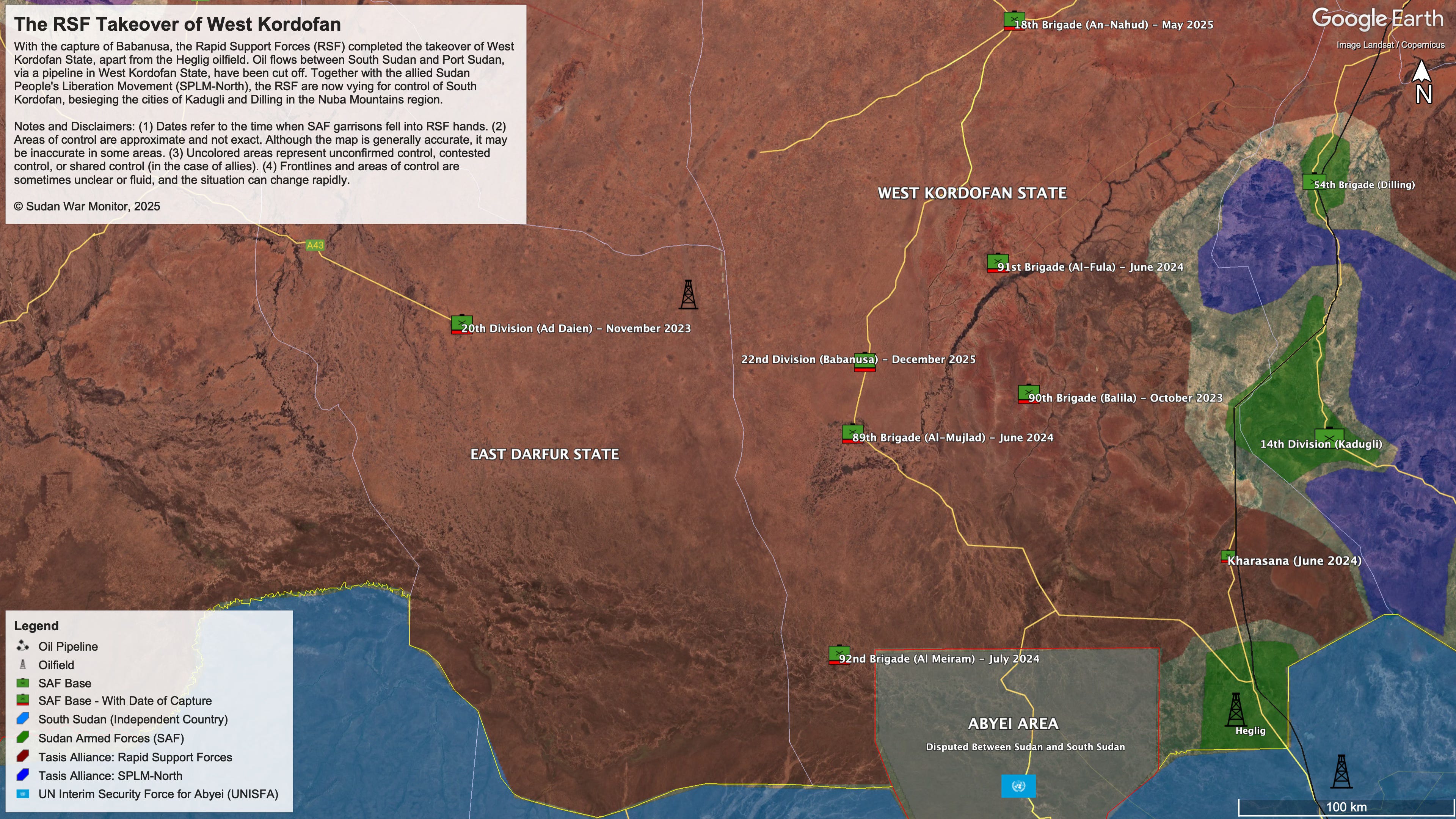 Following the capture of Babanusa, the 22nd Division is reduced to just one surviving brigade, positioned at the Heglig oilfield in the southeastern corner of West Kordofan, along the border with South Sudan. Fighting at this location could damage Chinese economic interests; the RSF thus far has largely refrained from attacking Heglig, apart from limited drone strikes.